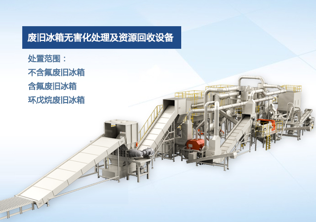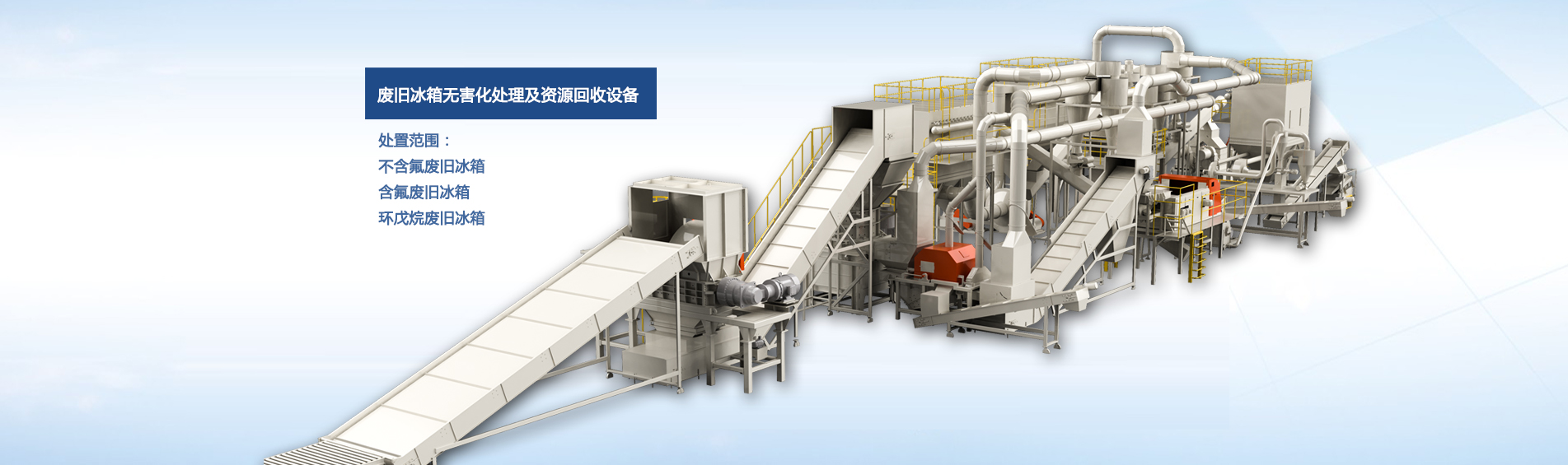 公司自主研發(fā)的廢舊冰箱無害化處理及資源回收技術及設備, 獨具 “雙軸撕碎機+立式破碎機+大風量稀釋環(huán)戊烷氣體”的專利組合設計, 主要用于對廢舊冰箱中的各種原材料進行分離、 回收和利用, 具有自主知識產權, 經國家工業(yè)和信息化部科技成果鑒定為 “填補國內空白, 達到國際先進水平” 。